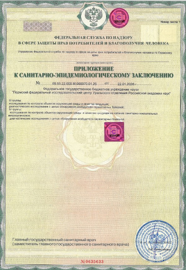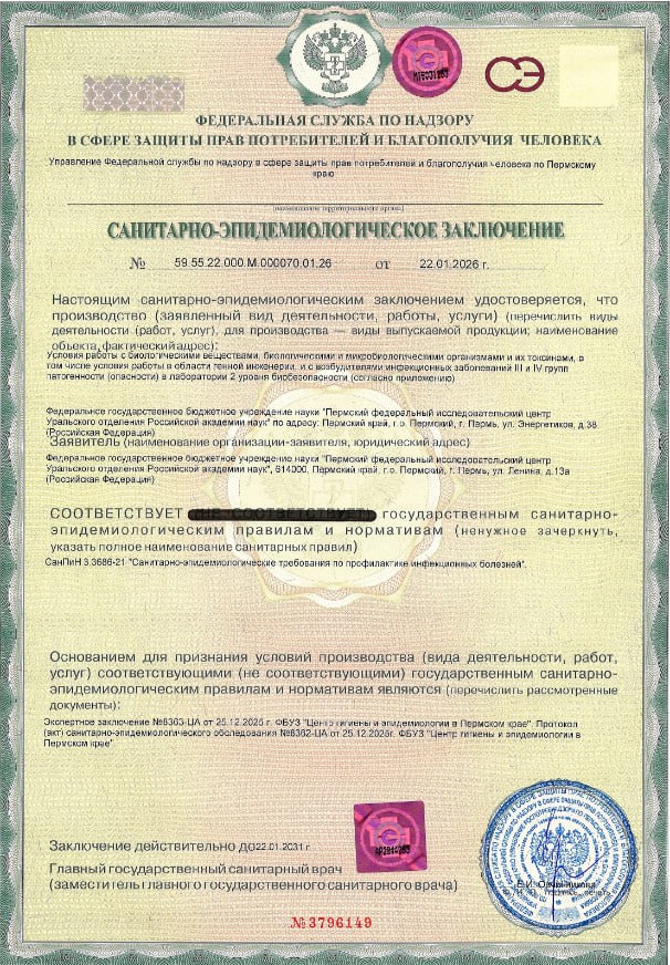 Лаборатория расширяет область аккредитации на микробиологические методики исследования. 22 января 2026 года в Управлении Роспотребнадзора по Пермскому краю было получено санитарно-эпидемиологическое заключение на условия работы с биологическими веществами, биологическими и микробиологическими организмами и их токсинами, в том числе на условия работы в области генной инженерии, и с возбудителями инфекционных заболеваний III и IV группы патогенности в лаборатории 2 уровня биобезопасности.