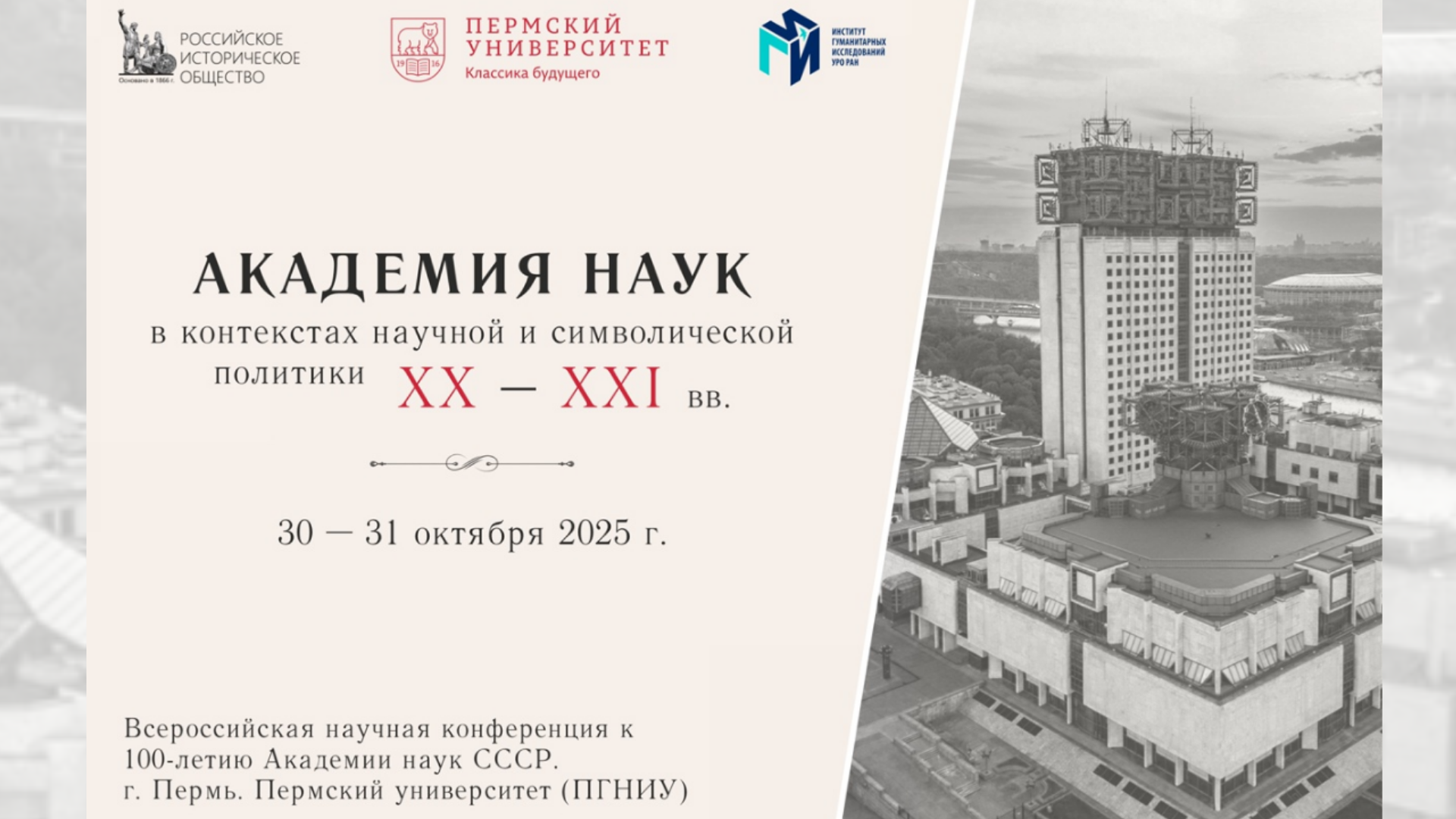 30 и 31 октября в Перми на базе Пермского государственного национального исследовательского университета (ПГНИУ) и Института гуманитарных исследований ПФИЦ УрО РАН прошла всероссийская научная конференция «Академия наук в контекстах научной и символической политики XX – XXI вв.», приуроченная к 100-летию Академии наук СССР.