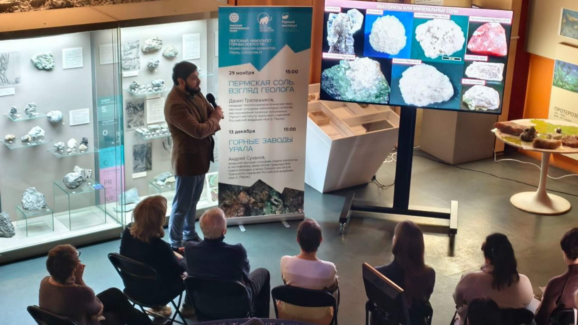 Первая лекция из цикла научного лектория “Факультет горных искусств” состоялась 29 ноября. Научный сотрудник лаборатории геологии месторождений полезных ископаемых ГИ УрО РАН Данил Трапезников посвятил слушателей в тонкости добычи соли в Пермском крае и за его пределами.